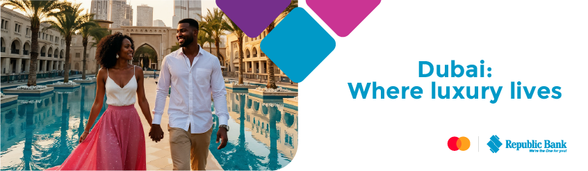 During the period September 5 – November 28, 2025, every EC$10,800 you spend with your Republic Bank Mastercard, will earn you a chance to win the Grand Prize of a Priceless Experience for 2 persons to Dubai!